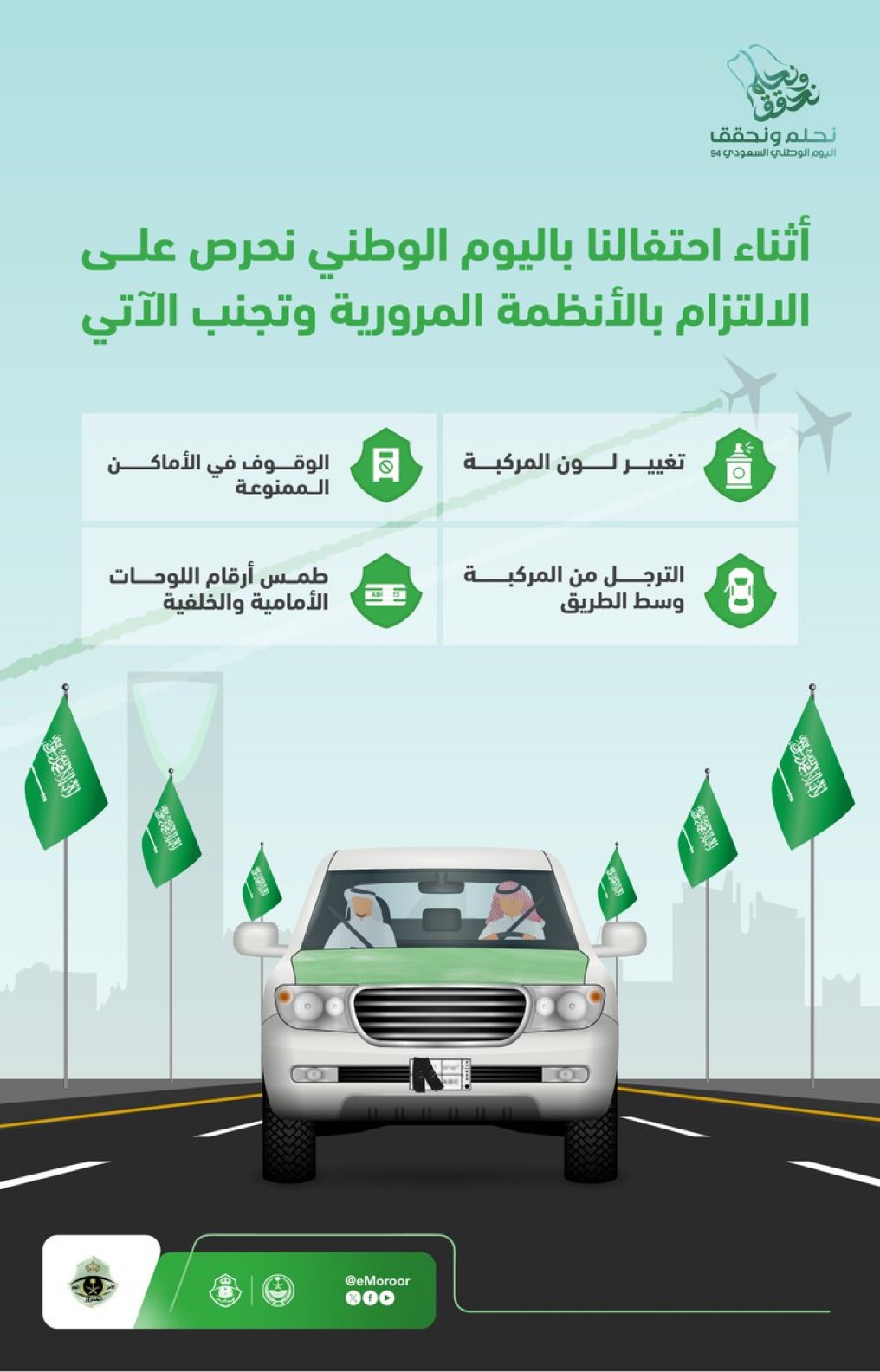 بالتزامن مع احتفالات اليوم الوطني السعودي الـ94، دعا المرور السعودي المواطنين والمقيمين إلى ضرورة الالتزام بالأنظمة المرورية حفاظًا على السلامة العامة.