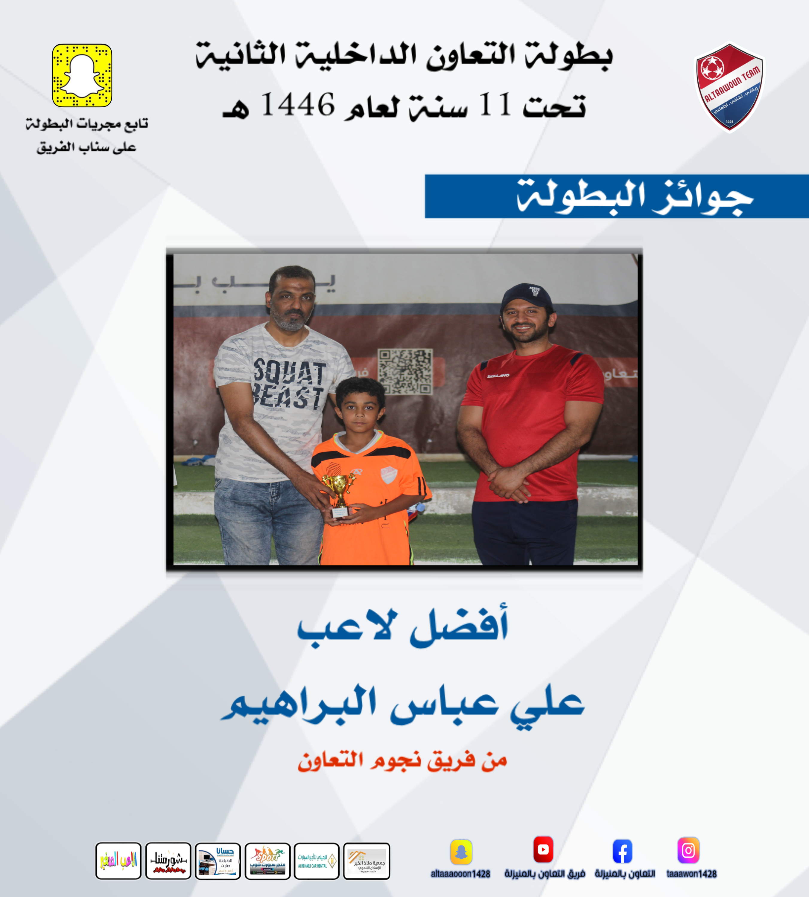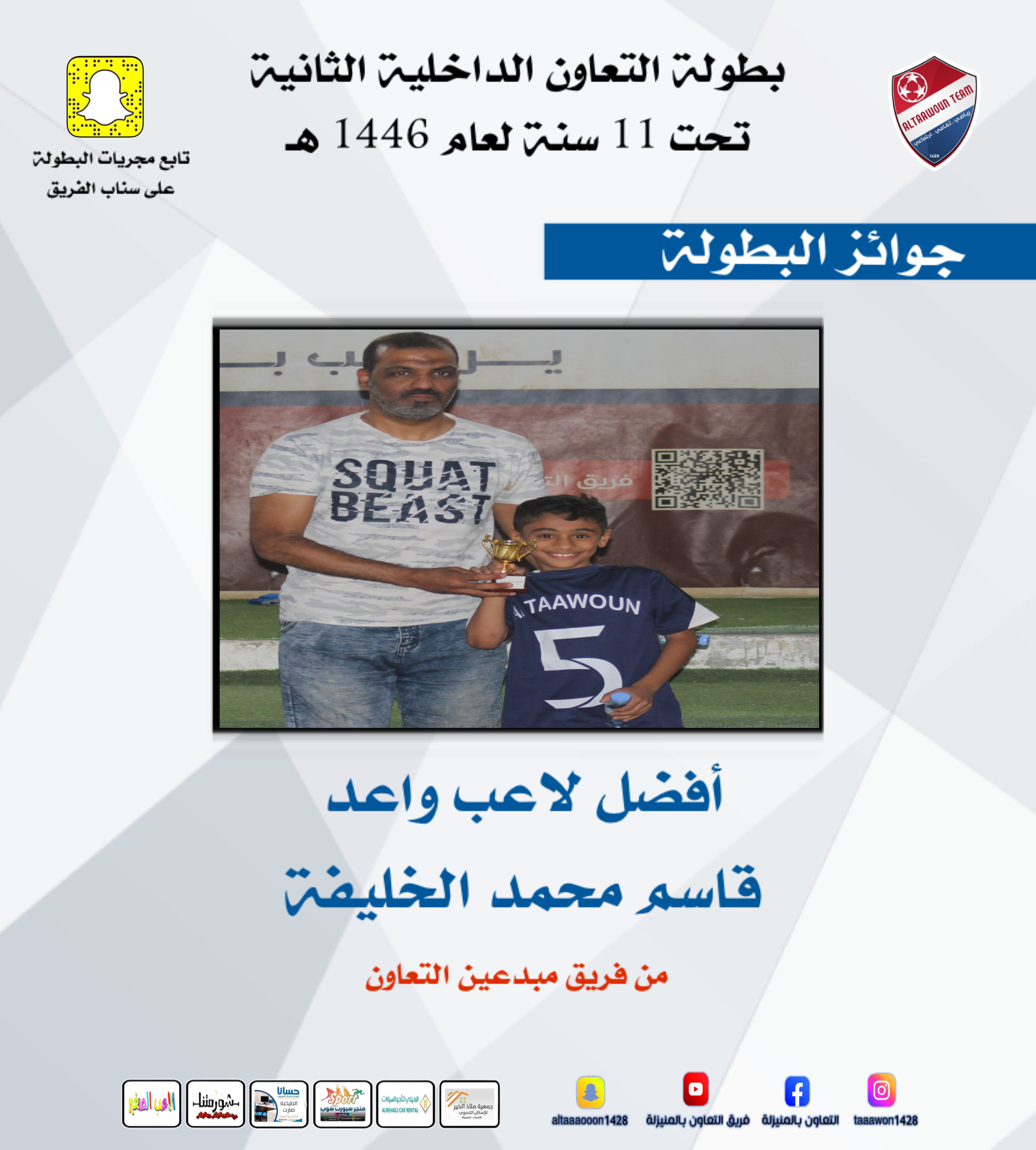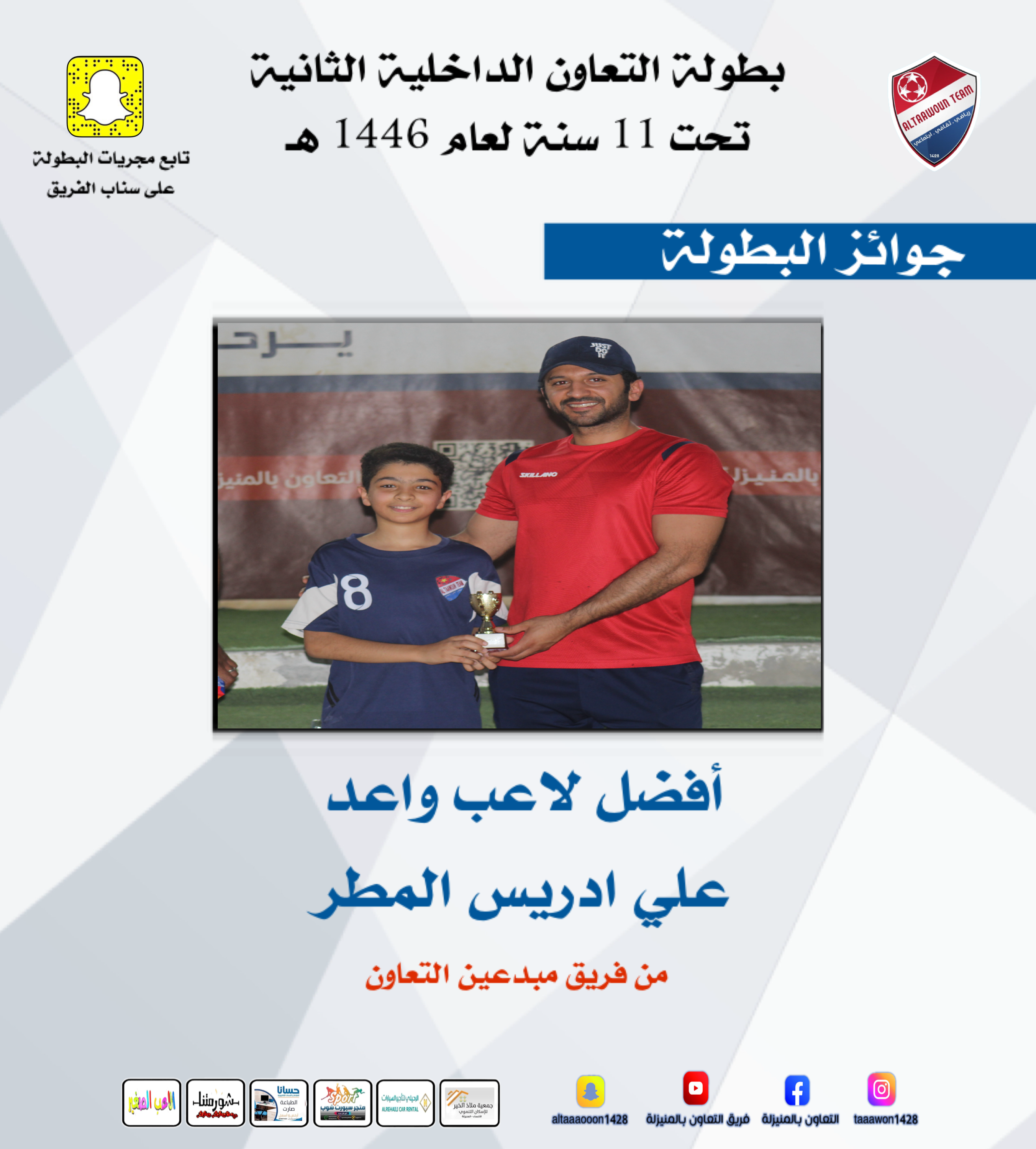 اختتم فريق التعاون بالمنيزلة، البطولة الداخلية فئة البراعم تحت 11 سنة يوم الاربعاء الماضي لعام 1446هـ . وقد جمعت المباراة الختامية فريقي “مبدعين التعاون” و فريق “نجوم التعاون” والتي انتهت بفوز “مبدعين التعاون” بنتيجة 5-3 بحضور آباء اللاعبين و إدارة فريق التعاون .