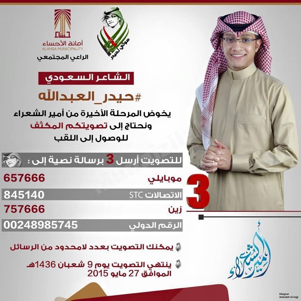يستمر التصويت للشاعر الأحسائي الشاب حيدر العبدالله بمسابقة أمير الشعراء حتى يوم الخميس القادم ، على من يرغب بالتصويت والمؤازرة للشاعر الصغير إرسال الرقم 3 برسالة نصية إلى :