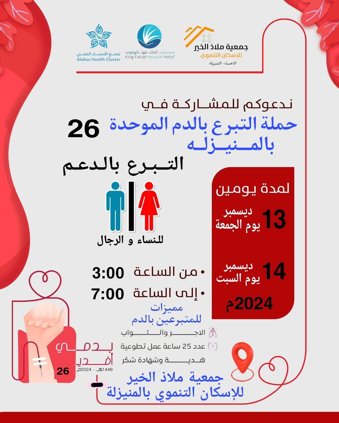 أعلنت جمعية “ملاذ الخير للإسكان التنموي” بالشراكة مع مستشفى الملك فهد بالهفوف وتجمع الأحساء الصحي، عن إطلاق حملة التبرع بالدم الموحدة (26) في المنيزلة، وذلك يومي الجمعة والسبت الموافقين 13 و14 ديسمبر 2024، من الساعة 3:00 عصرًا حتى 7:00 مساءً، “للرجال والنساء”