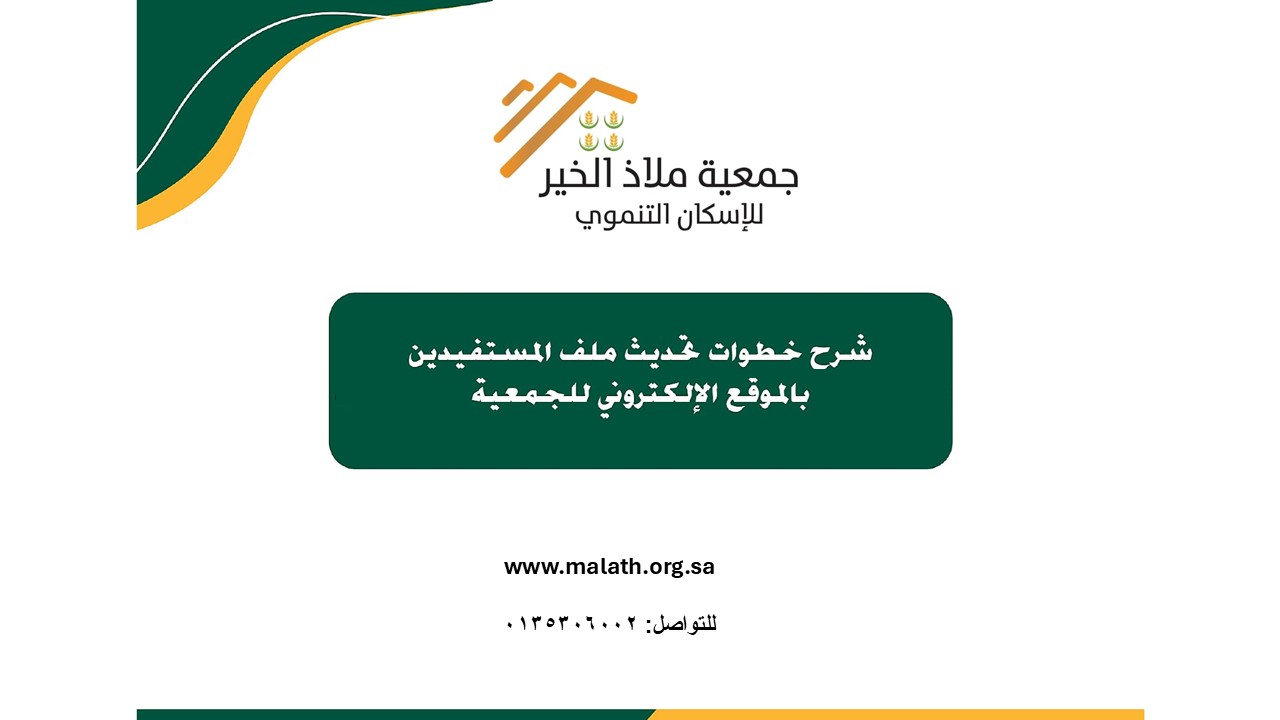 تعلن جمعية ملاذ الخير للإسكان التنموي بالمنيزلة لمستفيديها الكرام من خدماتها الإسكانية عن ضرورة تحديث بيانات ملفاتهم عبر الموقع الإلكتروني ، دون الحاجة لزيارة مقر الجمعية.
