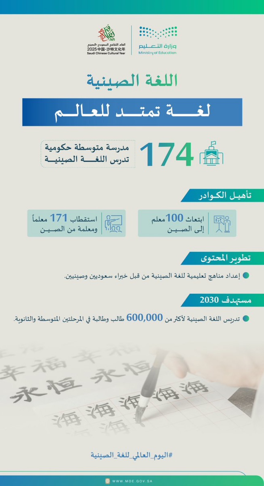 قالت وزارة التعليم، إن 174 مدرسة متوسطة حكومية باتت تُدرّس اللغة الصينية في مختلف مناطق المملكة، في إطار الاستعداد للعام الثقافي السعودي الصيني 2025.