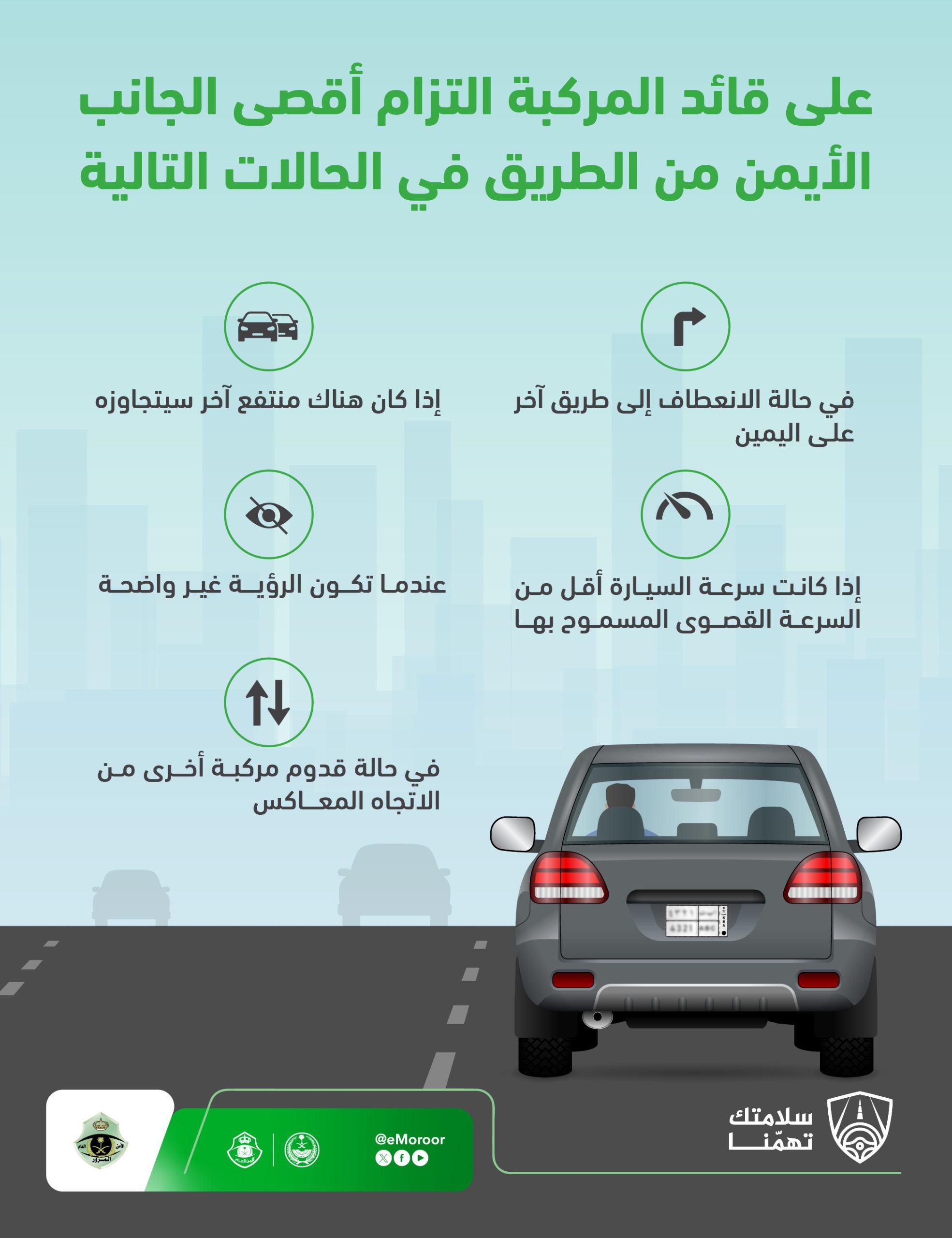 أوضح الإدارة العامة للمرور عبر حملة توعوية مرئية نُشرت على حسابها الرسمي في منصة “إكس”، الحالات التي يجب على قائد المركبة فيها الالتزام بأقصى الجانب الأيمن من الطريق، وذلك ضمن جهودها المستمرة في تعزيز الوعي المروري والالتزام بقواعد السلامة على الطرق.