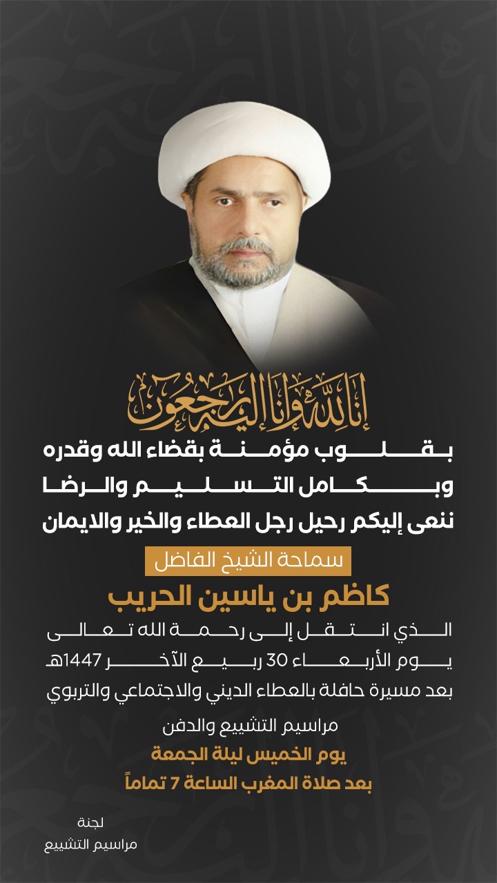 أعلنت لجنة تشييع فقيد العطاء والخدمة سماحة الشيخ والمربي الفاضل كاظم بن ياسين الحريب، عن تفاصيل مراسم التشييع والدفن والعزاء التي ستُقام يوم غدٍ الخميس ليلة الجمعة عند الساعة السابعة مساءً في مقبرة المنيزلة الجنوبية.