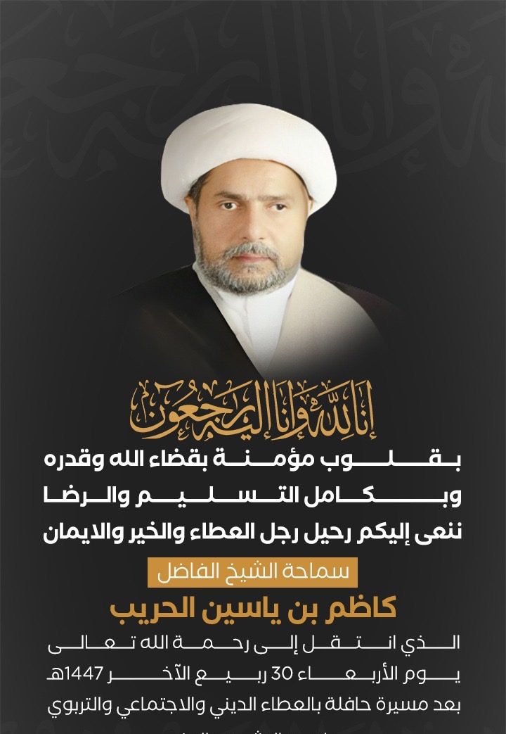 ببالغ الحزن وعميق الأسى، وبقلوب يعتصرها الألم ولوعة المصاب، نقدم أحرّ التعازي لمولانا صاحب العصر والزمان (عجل الله تعالى فرجه الشريف)، والحوزة العلمية، والعلماء الأفاضل، وأهالي المنيزلة الكرام، في رحيل سماحة الشيخ العلامة كاظم ياسين الحريب إلى الملكوت الأعلى.