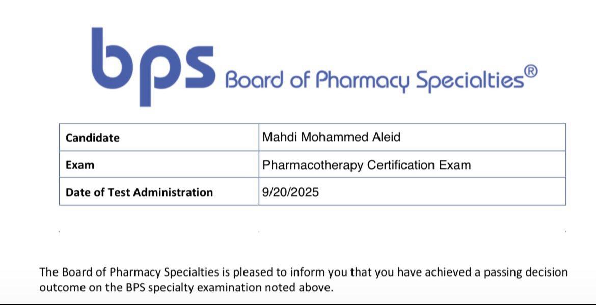 حصل الدكتور مهدي محمد مسلم العيد على البورد السعودي – الدراسات العليا – في الصيدلة السريرية والتي تعادل درجة الماجستير المهنية بعد اكتمال جميع متطلبات البرنامج من الهيئة السعودية للتخصصات الصحية واجتياز الاختبار الكتابي والاختبار السريري العملي.