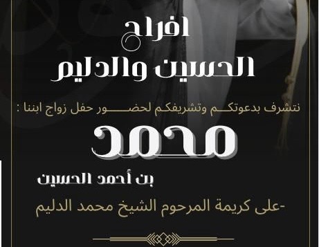 “صحيفة أصداء الديرة” تهنئ العريسين، وعائلتي الحسين الدليم، وتسأل الله أن يبارك لهما، ويرزقهما الذرية الصالحة، والحياة الزوجية السعيدة.