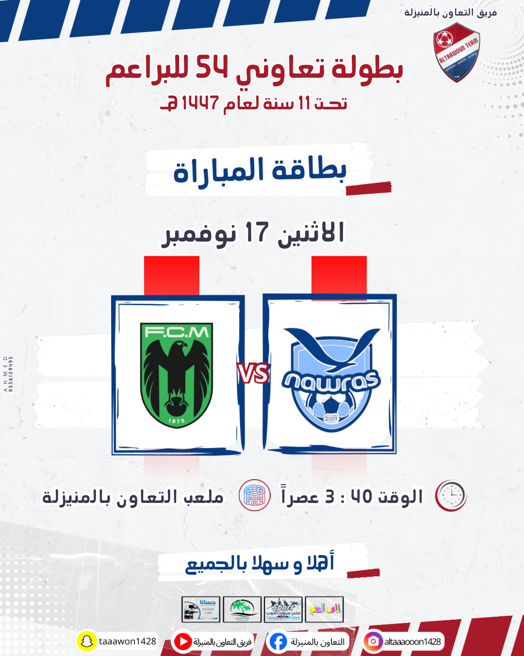 تعلن اللجنة المنظمة لبطولة تعاوني 54 للبراعم تحت 11 سنة لعام 1447هـ، عن إقامة حفل افتتاح البطولة يوم الاثنين 17 نوفمبر 2025، وذلك على ملاعب فريق التعاون بالمنيزلة.