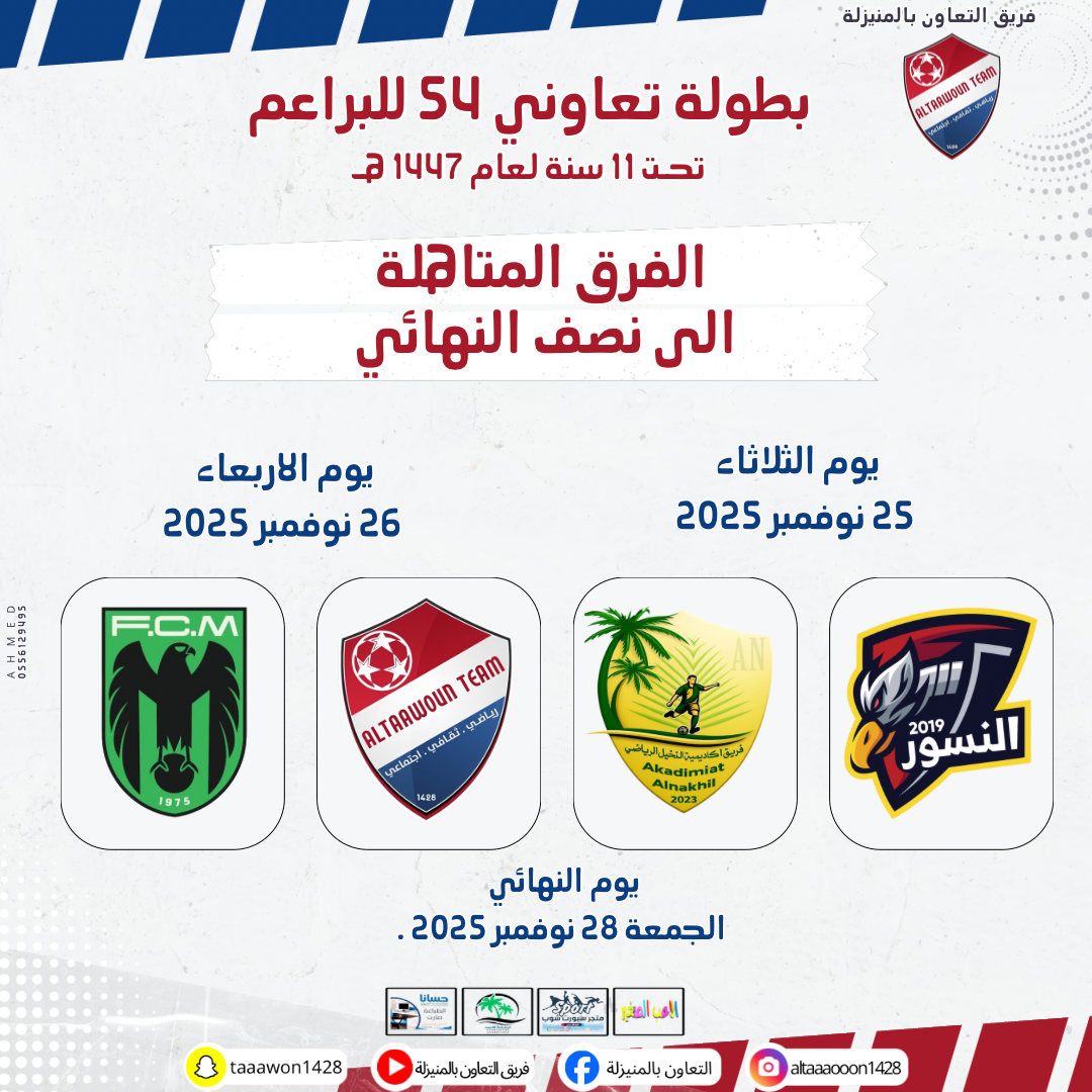 أما نصف النهائي الثاني فيُقام يوم الأربعاء، ويجمع بين التعاون × المنيزلة في مواجهة قوية تعدّ بمثابة ديربي تنافسي، ستحسم نتيجتها هوية الفريق الثاني المتأهل إلى النهائي.