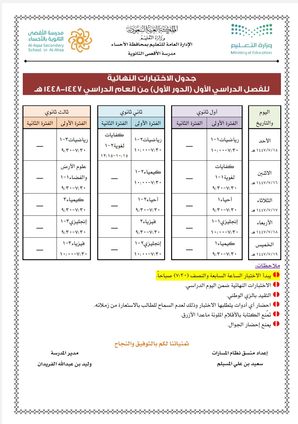 أعتمدت إدارة مدرسة الأقصى الثانوية جدول الاختبارات التحريرية للفصل الدراسي الأول ” الدور الأول” من العام ١٤٤٧هـ – ١٤٤٨هـ وذلك أبتداءً من الأربعاء ١١ /٧ /١٤٤٧هـ والذي يحتوي على أيام دراسية واختبارات.