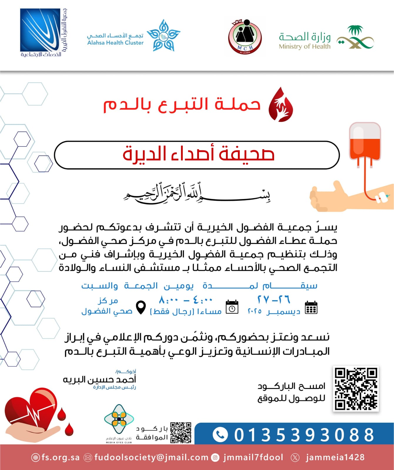 أطلقت جمعية الفضول الخيرية حملة للتبرع بالدم، وذلك بالتعاون مع وزارة الصحة وتجمع الأحساء الصحي ومستشفى النساء والولادة بالأحساء، في إطار دعم المبادرات الإنسانية وتعزيز المسؤولية المجتمعية.