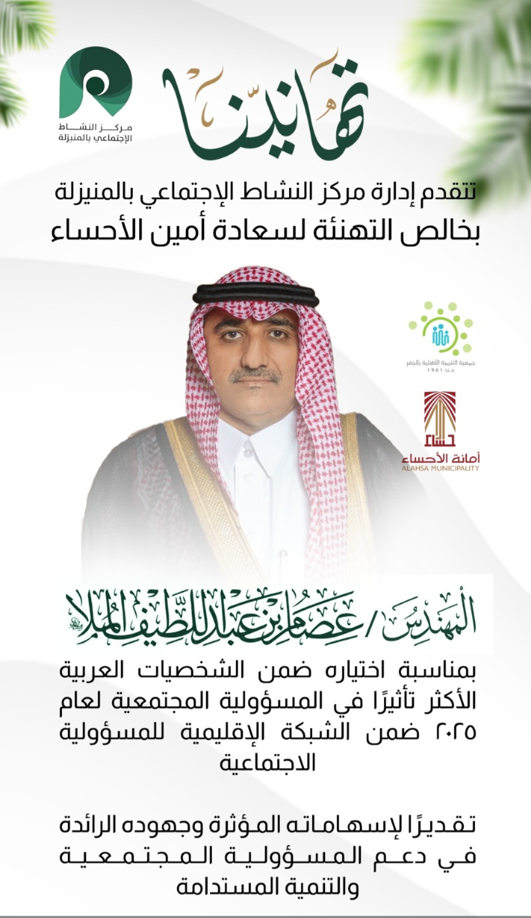 عين على الإحساء > مركز النشاط الاجتماعي بالمنيزلة يهنئ أمين الأحساء باختياره ضمن أكثر الشخصيات العربية تأثيرًا في المسؤولية المجتمعية لعام 2025