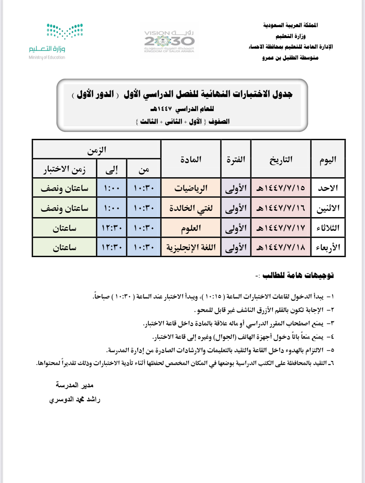 أعلنت متوسطة الطفيل بن عمرو بالمنيزلة في محافظة الأحساء، عن جدول الاختبارات النهائية للفصل الدراسي الأول (الدور الأول) للعام الدراسي 1447هـ، وذلك لطلاب الصفوف: الأول والثاني والثالث المتوسط.