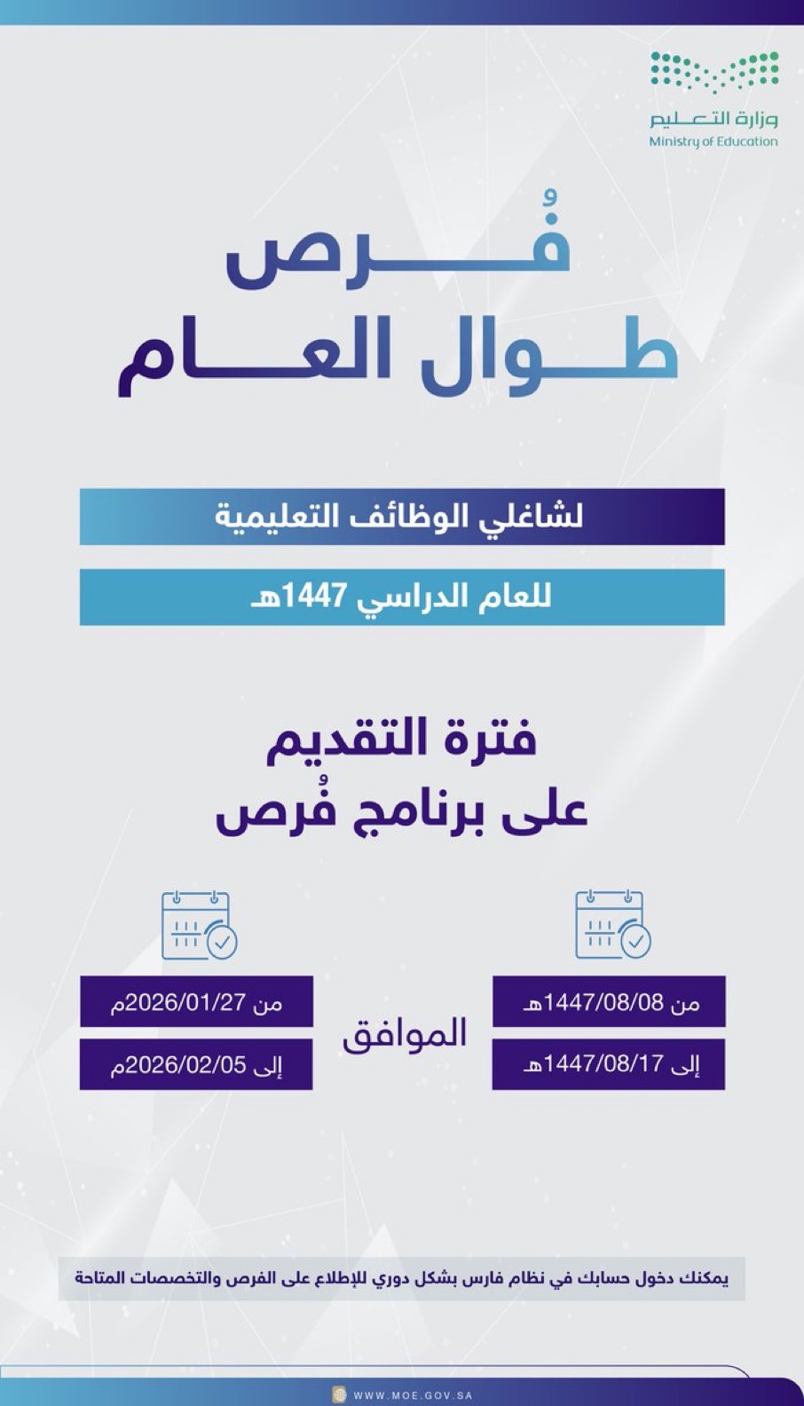 وأضافت الوزارة، عبر حسابها الرسمي بمنصة (إكس)، أن التقديم في الفترة من 8-8-1447هـ حتى 17-8-1447هـ، الموافق 27 – 1 – 2026م، 5 – 2 – 2025م.