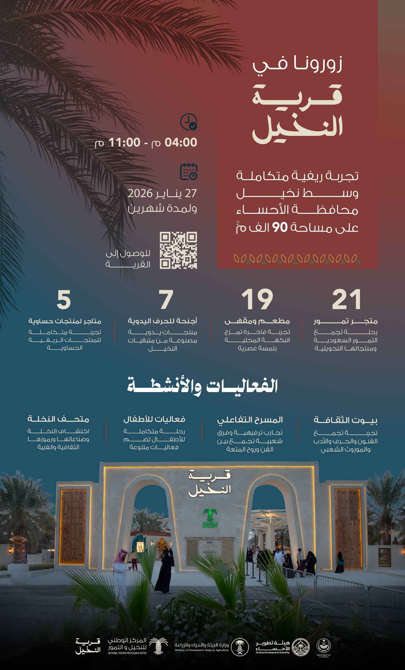 تنطلق اليوم الثلاثاء 27 يناير، فعاليات قرية النخيل في محافظة الأحساء، في تجربة ريفية متكاملة تحتفي بالنخيل والمنتجات الحساوية، وتستمر لمدة شهرين، يوميًا من الساعة الرابعة مساءً حتى الحادية عشرة ليلًا.
