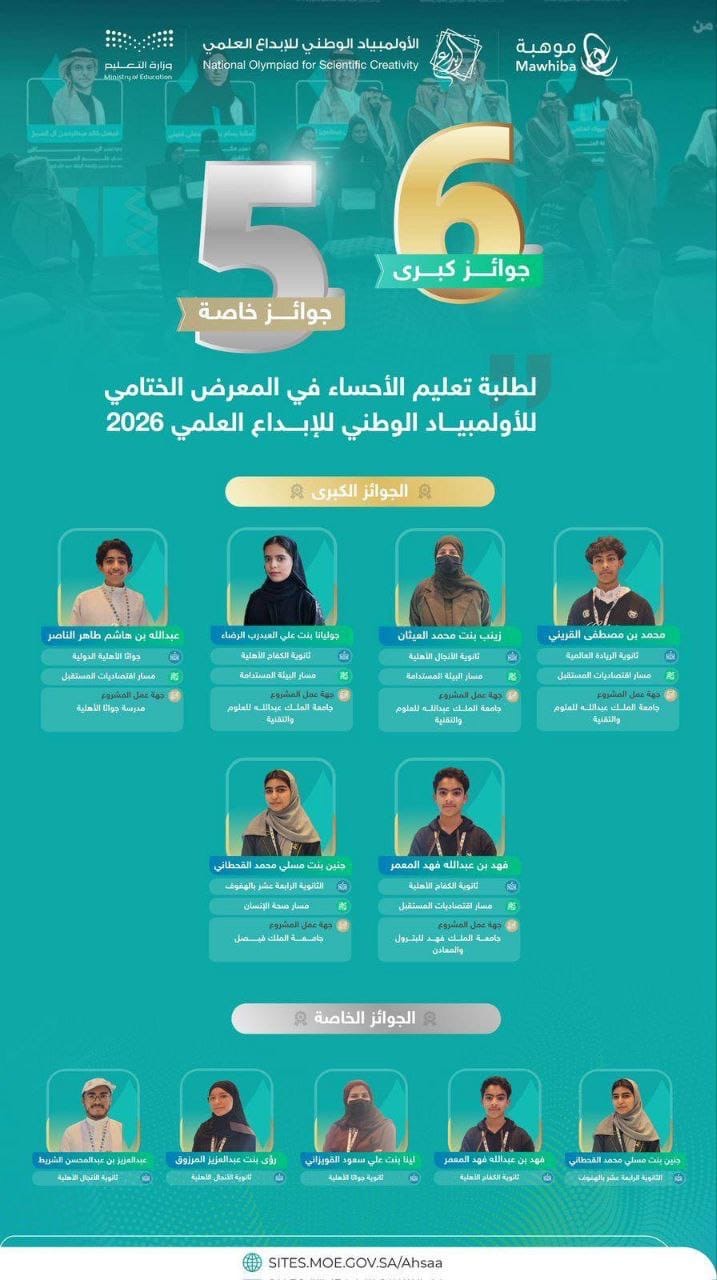 سجّل طلاب وطالبات تعليم الأحساء حضورًا مميزًا في المعرض الختامي للأولمبياد الوطني للإبداع العلمي 2026، بعد تحقيقهم عددًا من الجوائز الكبرى والخاصة، في إنجاز يؤكد تميزهم العلمي وقدرتهم على الابتكار والمنافسة على المستوى الوطني.
