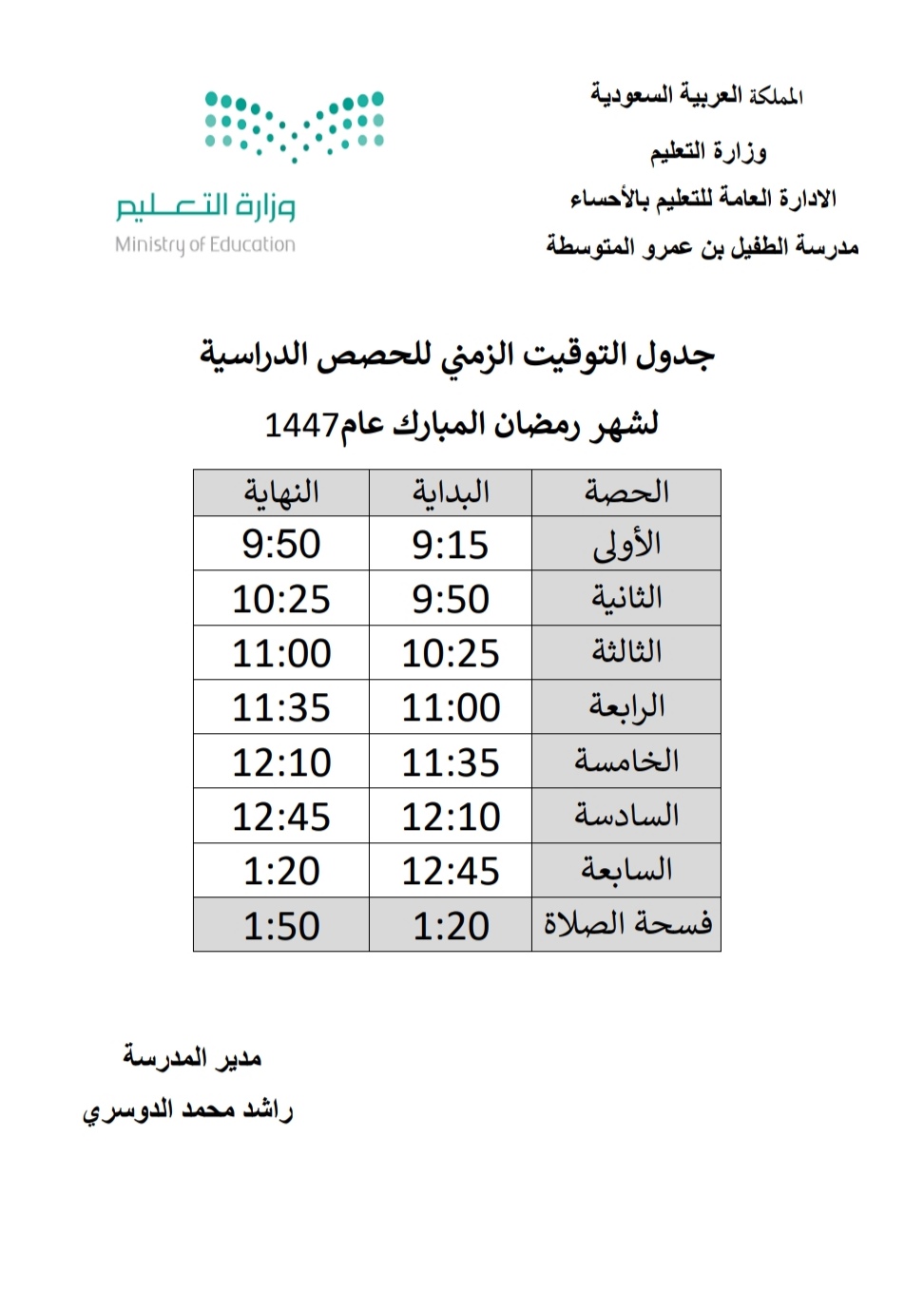 أعلنت مدرسة الطفيل بن عمرو المتوسطة بالمنيزلة عن جدول التوقيت الزمني للدوام الدراسي لشهر رمضان المبارك لعام 1447 هـ.