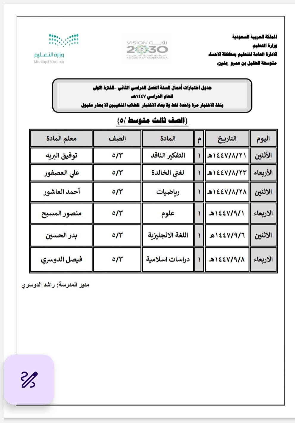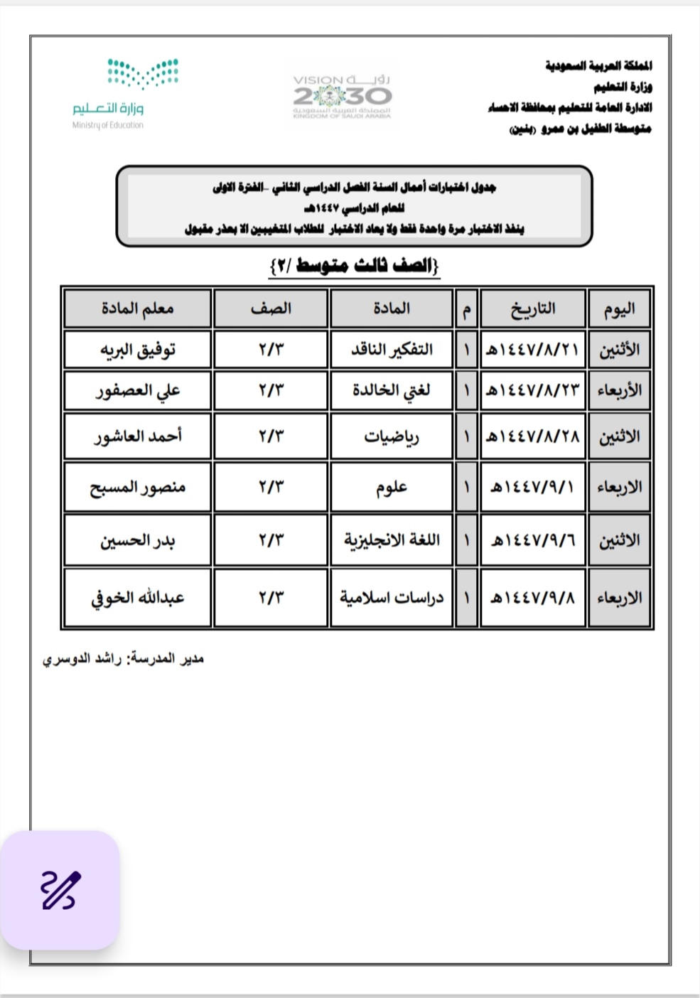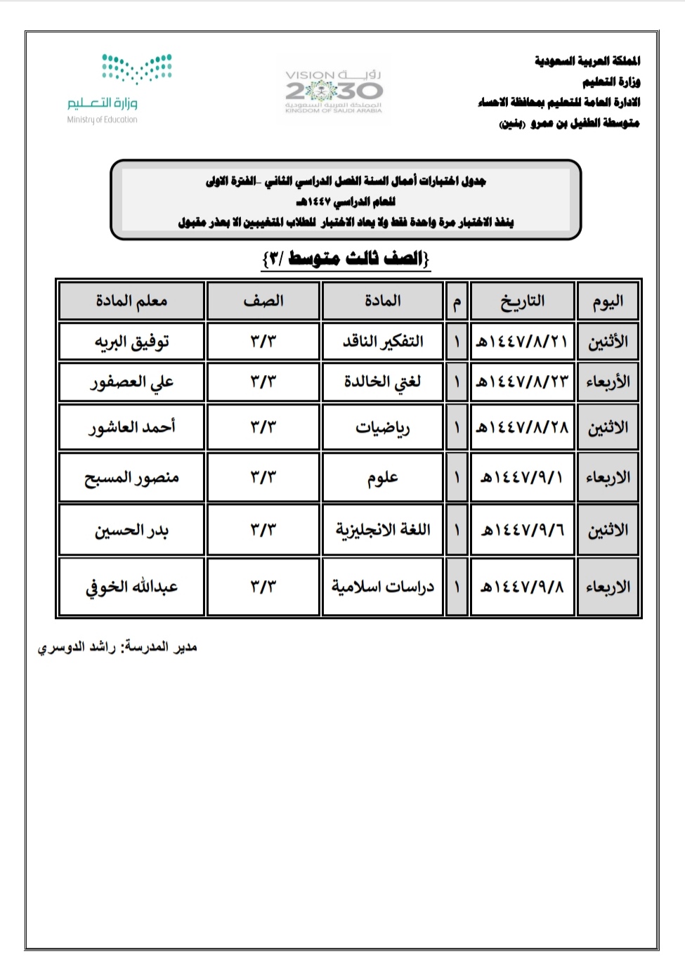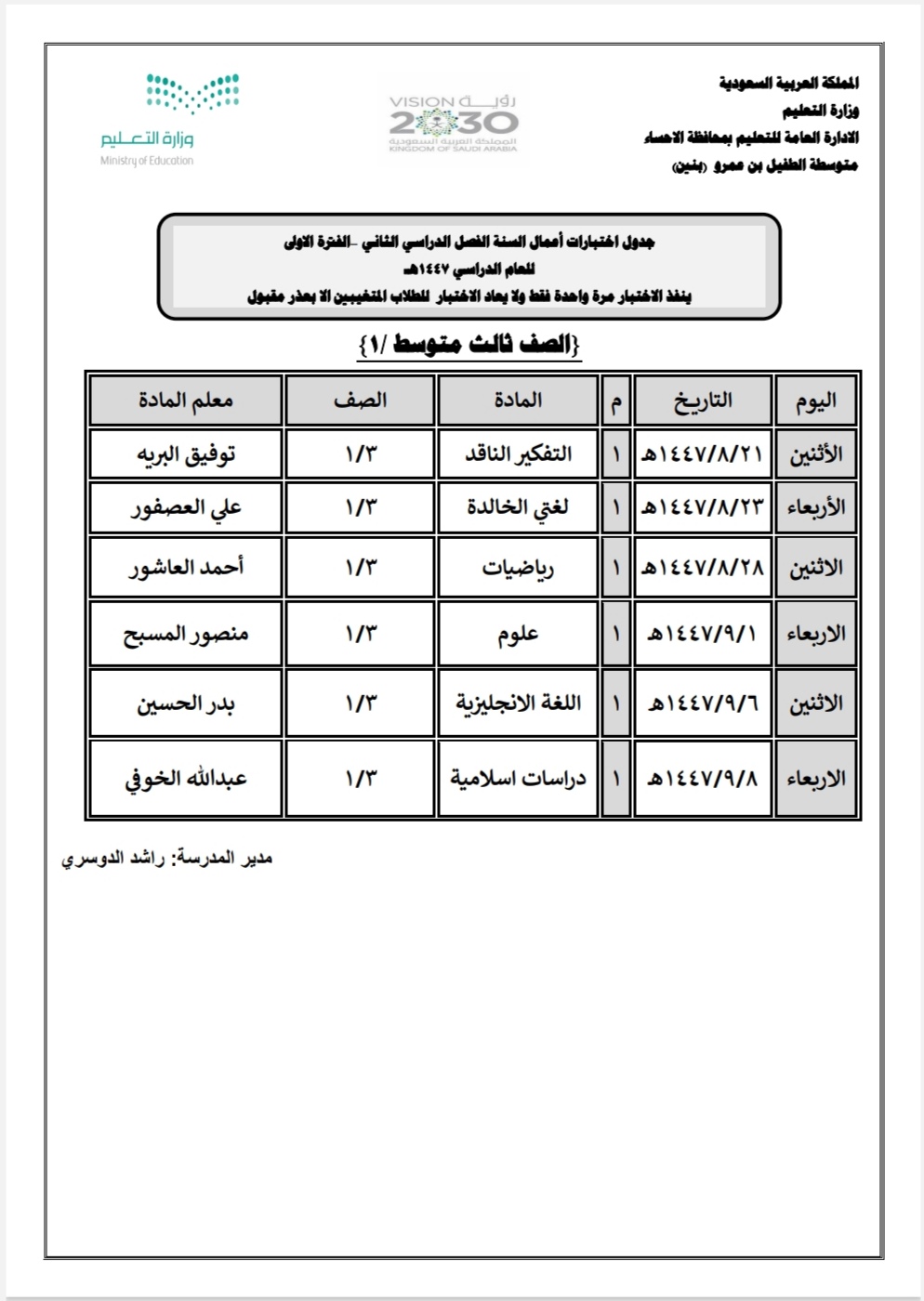 أعلنت مدرسة الطفيل بن عمرو المتوسطة بالمنيزلة عن جدول أعمال السنة الفترة الأولى لطلاب الصف الثالث متوسط.