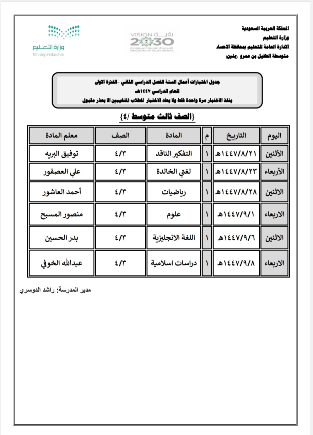 ونوهت إدارة المدرسة أن الجدول للإختبارات سيكون لكل فصل جدول خاص كما هو موضع بالجدول الخاص لكل فصل أسفل الخبر.