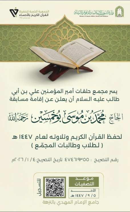 وتقام المسابقة بإشراف الجمعية الخيرية لتحفيظ القرآن الكريم بالأحساء، وبدعم وتنظيم من وزارة الشؤون الإسلامية والدعوة والإرشاد، في إطار الجهود المشتركة لتعزيز البرامج القرآنية وترسيخ القيم الإسلامية في المجتمع.