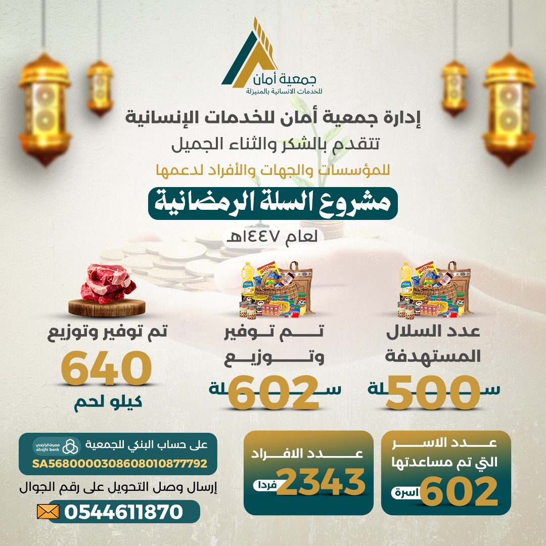 أعلنت جمعية أمان للخدمات الإنسانية عن نجاح تنفيذ مشروع السلة الرمضانية لعام 1447هـ، والذي استفادت منه مئات الأسر المحتاجة في المنيزلة ، ضمن جهود الجمعية المستمرة لتعزيز التكافل الاجتماعي خلال شهر رمضان المبارك.