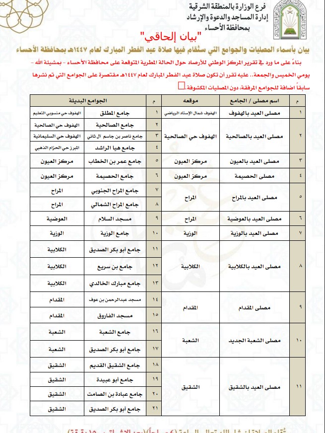أعلنت إدارة المساجد والدعوة والإرشاد بمحافظة الأحساء، التابعة لفرع الوزارة بالمنطقة الشرقية، عن صدور “بيان إلحاقي” يتضمن تعديلات على مواقع إقامة صلاة عيد الفطر المبارك لعام 1447هـ في عدد من المراكز والهجر التابعة للمحافظة.