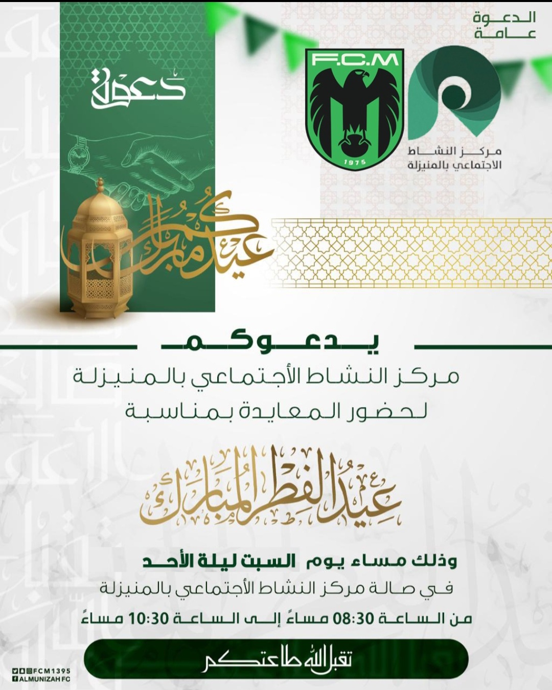 وجّه مركز النشاط الاجتماعي بالمنيزلة دعوة عامة للأهالي للمشاركة في حفل المعايدة بمناسبة عيد الفطر المبارك، وذلك في أجواء احتفالية تهدف إلى تعزيز التواصل الاجتماعي وإحياء مظاهر الفرح بالعيد.