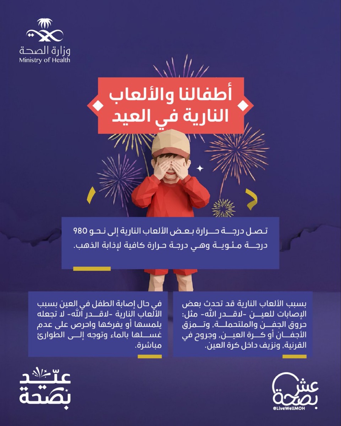 حذرت وزارة الصحة ممثلة في منصة “عش بصحة” التوعوية من مخاطر الألعاب النارية في العيد على الأطفال خاصة.