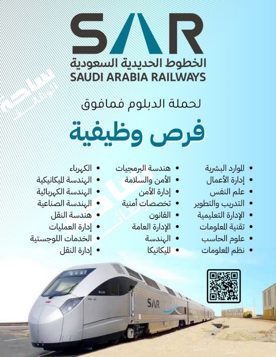 وأكدت الشركة أن التقديم متاح عبر القنوات الرسمية، حيث يمكن للمهتمين الاطلاع على التفاصيل والشروط من خلال رمز الاستجابة السريعة (QR) الظاهر في الإعلان، داعية الكفاءات الوطنية إلى الاستفادة من هذه الفرص والانضمام إلى قطاع النقل السككي الذي يشهد نمواً متسارعاً في المملكة.
