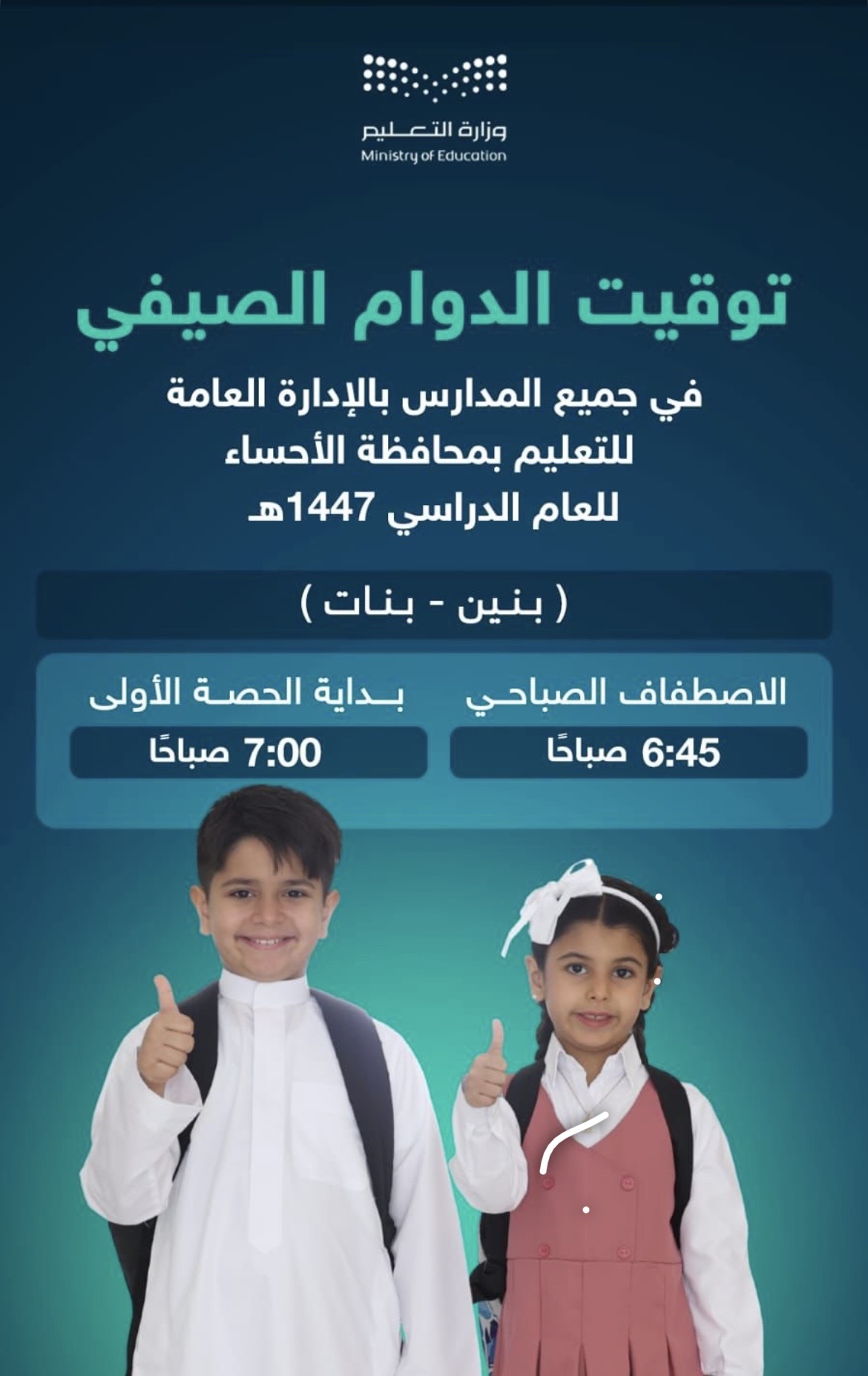 أعلنت وزارة التعليم، عبر الإدارة العامة للتعليم بمحافظة الأحساء، اعتماد مواعيد الدوام الصيفي في جميع مدارس المحافظة (بنين وبنات) للعام الدراسي 1447هـ، وذلك ضمن الاستعدادات لتنظيم اليوم الدراسي بما يتناسب مع ارتفاع درجات الحرارة خلال فصل الصيف.