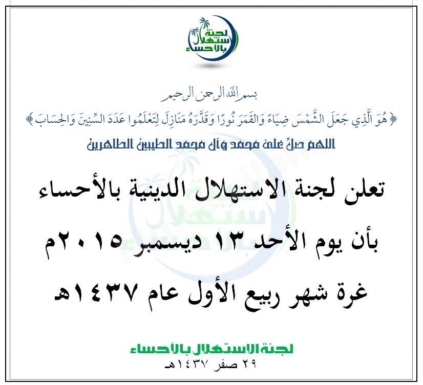 أعلنت لجنة الإستهلال الدينية بالأحساء أن يوم الأحد ١٣ ديسمبر ٢٠١٥ م غرة شهر ربيع الأول لعام ١٤٣٧هـ .