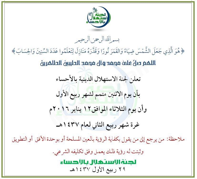 بالأحساء بيانًا أعلنت فيه أن اليوم الإثنين هو المتمم لشهر ربيع الأول ١٤٣٧هـ وأن يوم غدٍ الثلاثاء سيكون غرة ربيع الآخر ، منبهةً من يرجع إلى كفاية الرؤية بالعين المسلحة أو بوحدة الأفق أو التطويق وثبتت له رؤية ذلك بأن بعمل حسب تكليفه الشرعي .