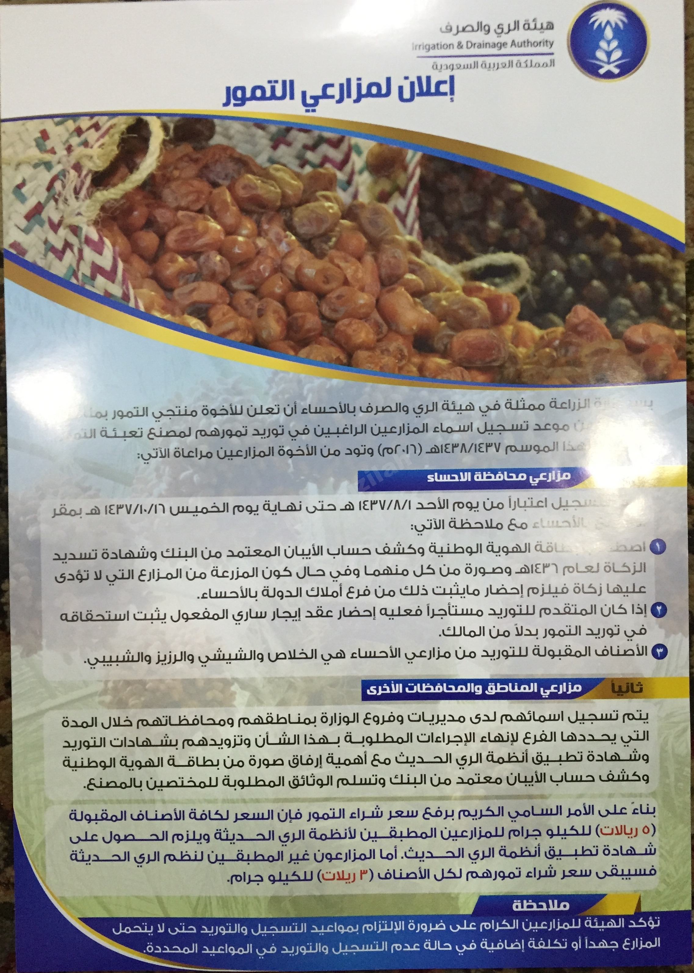 حددت هيئة الري والصرف بالأحساء فترة تسجيل طلبات مزارعي الأحساء الراغبين في توريد تمورهم إلى مصنع تعبئة تمور الأحساء حيث سيكون البدء بتسجيل الطلبات في يوم الأحد الموافق ١ شعبان / ١٤٣٧هـ كما حدد يوم الخميس ١٦ شوال / ١٤٣٧هـ آخر موعد لتسجيل الطلبات وفق الإجراءات والنظم المتبعة في هذا الشأن .