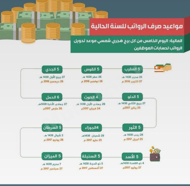 وقالت الوزارة في بيان لوكالة الأنباء السعودية: إنه سيتم صرف راتب الشهر القادم في اليوم الخامس من برج القوس الموافق لليوم السادس والعشرين من شهر نوفمبر 2016م ، وسيستمر الصرف وفق هذا التنظيم مستقبلاً .