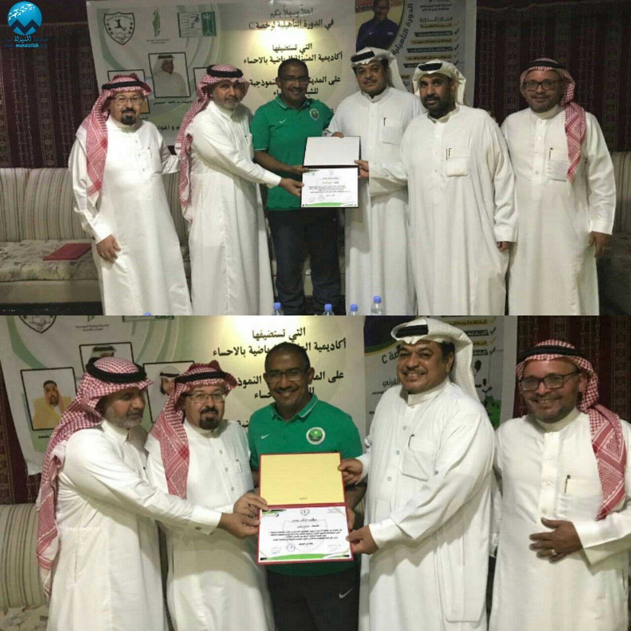 أختتمت الأسبوع الماضي أكاديمية المنيزلة الدورة التدريبية التأهيلية c ( للرخصة c للمدربين ) كان ذلك بحضور الاستاذ معيض العرجاني رئيس رابطة احياء الاحساء لكرة القدم والاستاذ ابراهيم الخميس الداعم الاحسائي الرياضي الاول و الاستاذ ابراهيم العسكري عضو المجلس الاستشاري برابطة احياء الاحساء و الاستاذ امين المحمد رئيس امناء اكاديمية المنيزلة الرياضية بالاحساء و عضو المجلس الاستشاري برابطة احياء الاحساء و الاستاذ صادق الحرز الاعلامي الكبير و الاستاذ اسماعيل المطر صاحب المدينة الرياضية النموذجية للشباب بالاحساء و الاستاذ عبدالحميد المحمد رئيس اكاديمية المنيزلة .