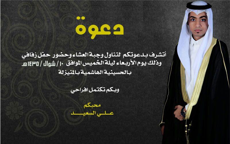 يتشرف الحاج حسين علي السعيد بدعوتكم لحضور حفل زفاف نجله (علي) ، وذلك مساء يوم الاربعاء ليلة الخميس 1435/10/10هـ الموافق 2014/8/6م ، للرجال في الحسينية الهاشمية بالمنيزلة و للنساء في قاعة ليالي “2”.