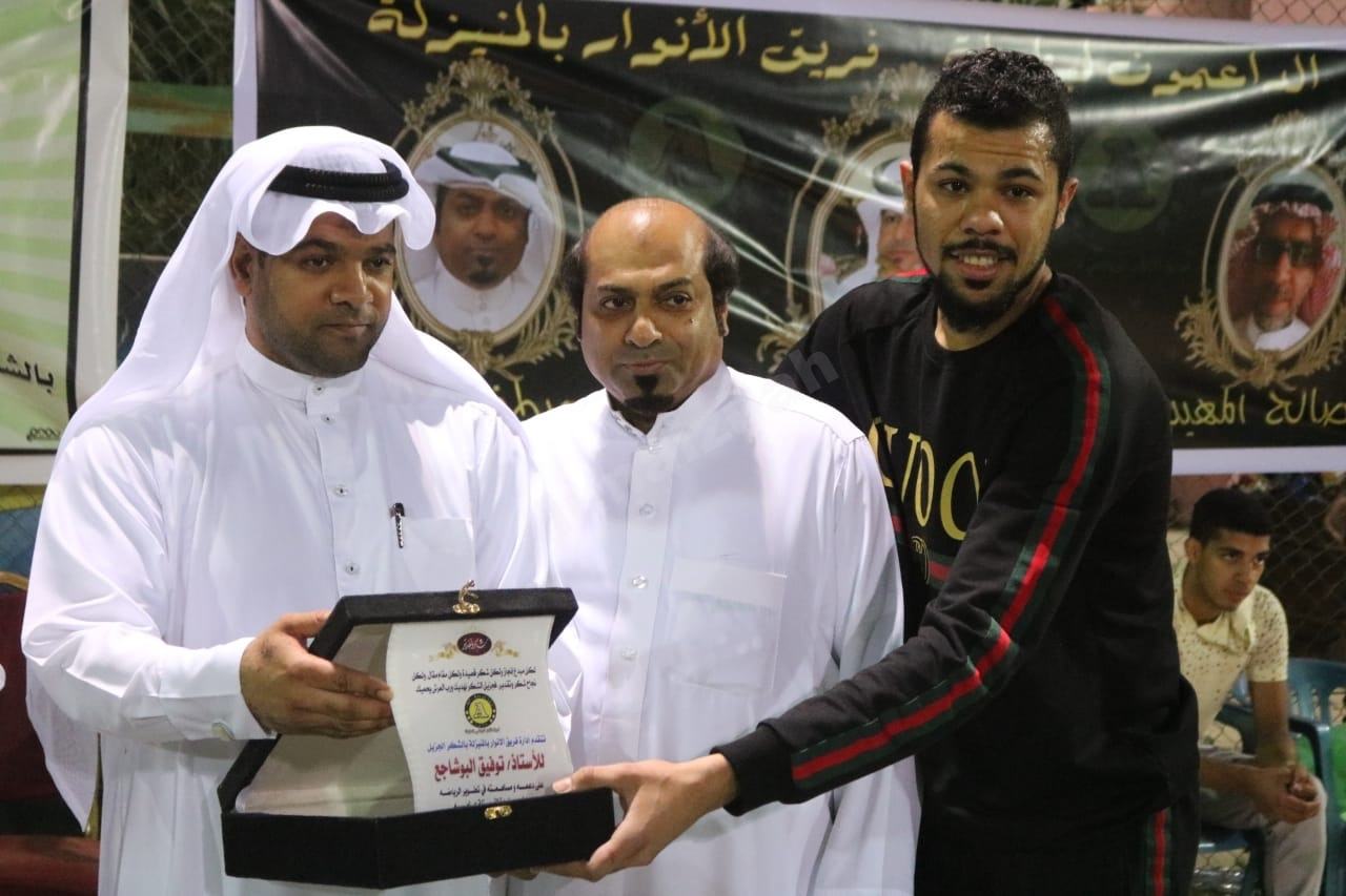 اختتم فريق الأنوار بالمنيزلة بطولته يوم الجمعة والمقامة على ملعب الجوهرة العشبي بفوز فريق السيكونس بالفضول بالبطولة بعد تغلبه على فريق ليفربول بالجفر بهدفين دون مقابل ، حكم اللقاء الحكمان حسين الحمد وسعيد النويحل وعلق عليه حبيب العساكر ، وبين الشوطين كرمت إدارة الأنوار كلاً من الداعمين توفيق بوشاجع وعبدالله العبدالله وصالح المهيني ومصطفى الراشد حيث قام بتسليمهم المشرف العام على الفريق مصطفى الدليم لدعمهم بطولة الأنوار على مستويات مختلفة ، وكانت شخصيات كثيرة قد حضرت النهائي داعمة وإعلامية وشخصيات اجتماعية أخرى منها توفيق بوشاجع وعبدالله العبدالله ومصطفى الراشد والإعلامي بوجعفر الدالوي والإعلامي عبدالمحسن الأحمد والداعم الرياضي وليد الذياب وعارف الدليم والإعلامي أحمد النجار ومحمد الصالح وعلي الرويشد وعبدالوهاب الباشا وحسين الحبيب وجمع غفير من جمهور الفريقين .