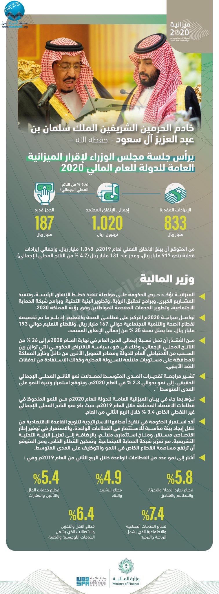 نشرت وزارة المالية “إنفوغرافيك” توضيحيًّا، يبيِّن المخصصات المعتمدة لمختلف القطاعات الحكومية في ميزانية العام المالي القادم 2020م، التي بلغ إجمالي الإنفاق فيها 1.020 مليار ريال.
