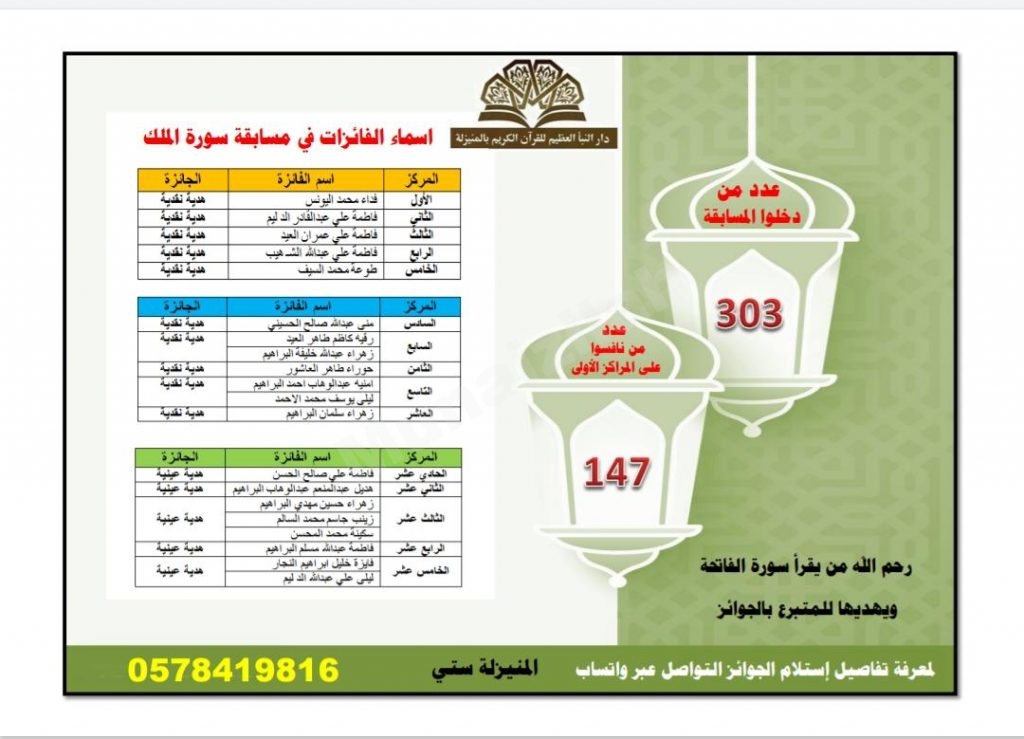 قال الله تعالى : (شهر رمضان الذي، اُنزل فيه القرآن، هدىً للناس، وبيناتٍ من الهدى والفرقان) شهر رمضان المبارك هو ربيع القرآن، فعن أبي جعفر الامام محمد الباقر عليه السلام قال: (لكل شيء ربيع وربيع القرآن شهر رمضان )، ويشهد القرآن الكريم إقبالا في شهر رمضان الكريم من المسلمين كافة لما له من الاجر والثواب المضاعف والتعاهد مع كتاب الله في ليالي نزوله في هذا الشهر المبارك ، وقد عمدت ادارة دار النبأ العظيم للقرآن الكريم بالمنيزلة الى إفشاء الاجواء القرآنية في المجتمع وحث المؤمنين والمؤمنات على الاقبال لحفظ بعض السور القرآنية في كل عام وفقد خصصت هذه السنة مسابقة حفظ سورة (الملك) عن بُعد عبر الكتابة الالكترونية ، فقد التحق بالمسابقة 303 متسابق ومتسابقة حيث دخل للمنافسة 147 متسابق ومتسابقة للفوز من المركز الأول الى المركز الخامس عشر .