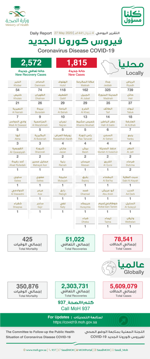 كما أعلنت عن تسجيل (2572) حالة تعافٍ جديدة ليصبح إجمالي عدد الحالات المتعافية (51,022) حالة ولله الحمد.