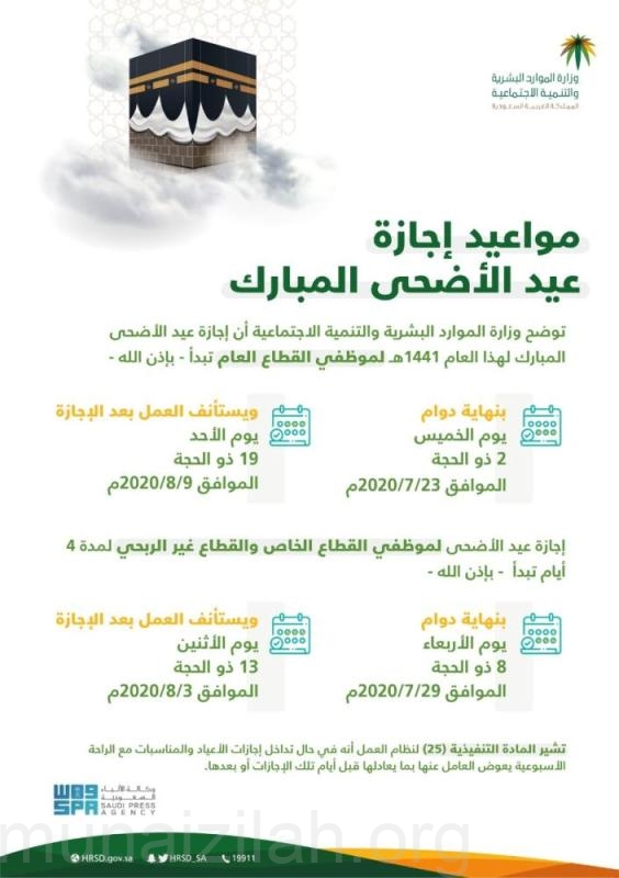 أشارت في بيان عبر حسابها – بتويتر- إلى أن إجازة القطاع العام: تبدأ بنهاية دوام يوم الخميس 2 ذي الحجة على أن يستأنف العمل يوم الأحد 19 ذي الحجة.