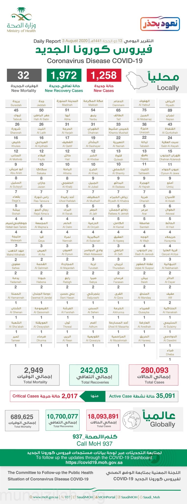 وبذلك يصبح مجموع حالات الإصابة منذ انتشار الفيروس في المملكة بوصل إلى (280093) إصابة.