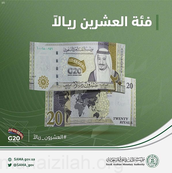 أعلنت مؤسسة النقد العربي السعودي “ساما” عزمها طرح فئة عشرين ريالاً من العملة الورقية السعودية بمناسبة رئاسة المملكة العربية السعودية لقمة مجموعة العشرين في عهد خادم الحرمين الشريفين الملك سلمان بن عبد العزيز آل سعود – حفظه الله -، وذلك استناداً إلى المادة (الرابعة) من نظام النقد السعودي الصادر بالمرسوم الملكي رقم 6 بتاريخ 01/07/1379هـ.