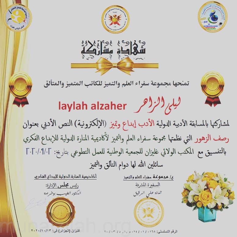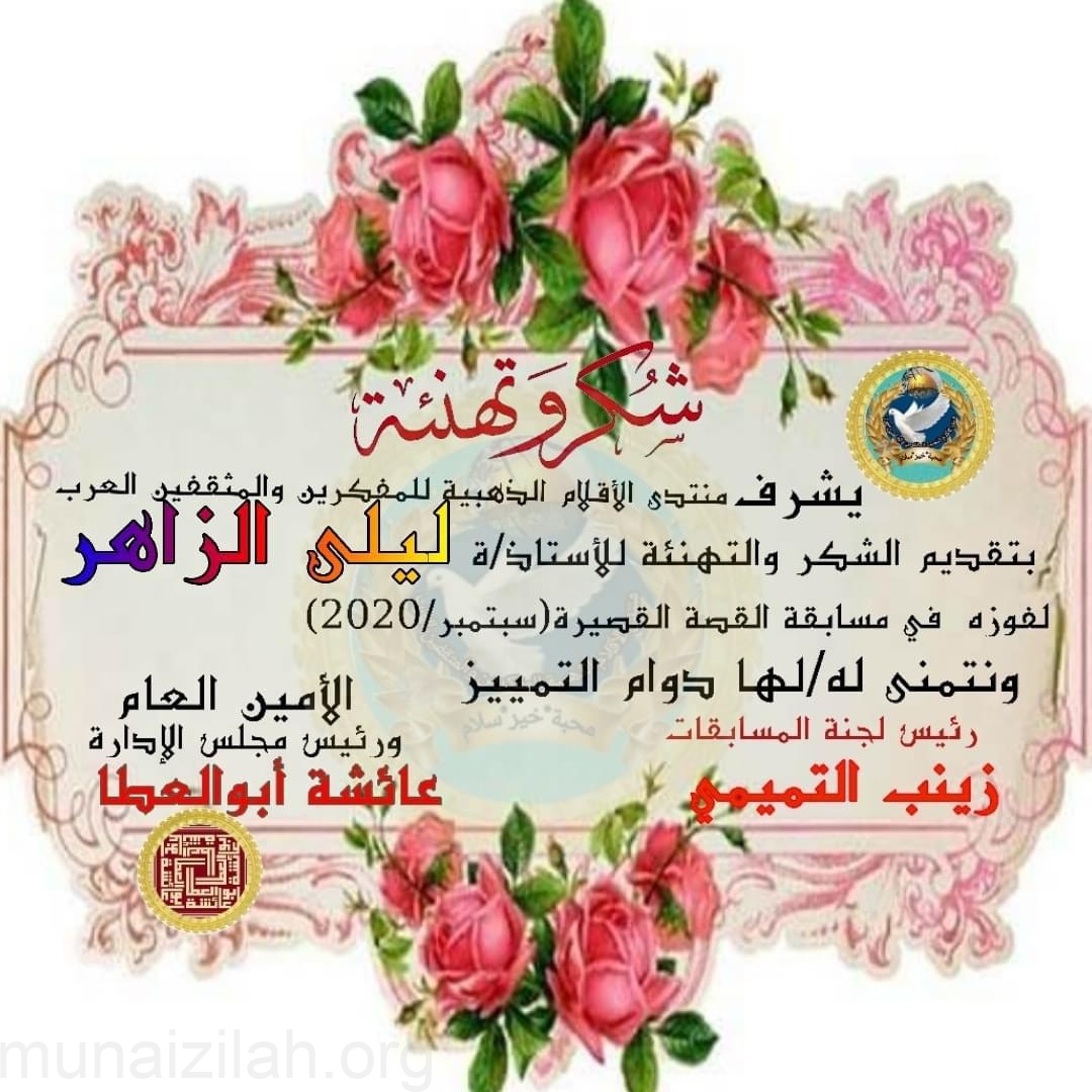 حصدت الكاتبة ليلى عبدالله الزاهر درع التميز في مسابقة القصة القصيرة في دورتها ( 14) والتي أقامها ملتقى ابن النيل الأدبي في جمهورية مصر العربية .