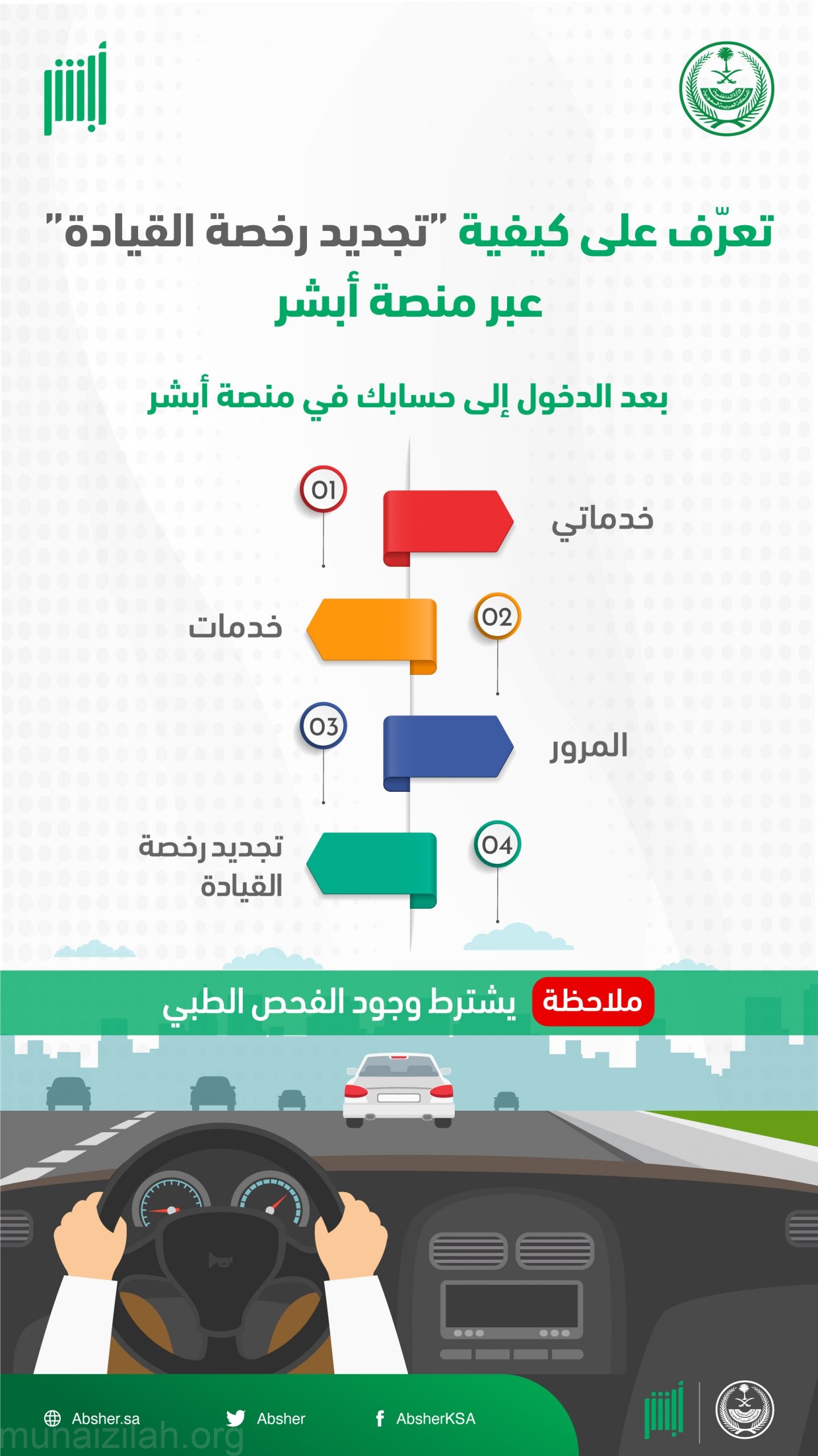 وأشارت “أبشر”، إلى إمكانية الوصول للخدمة من خلال تسجيل الدخول في منصة أبشر، والولوج إلى خدماتي، ثم خدمات ، ثم المرور ، ثم تجديد رخصة القيادة.