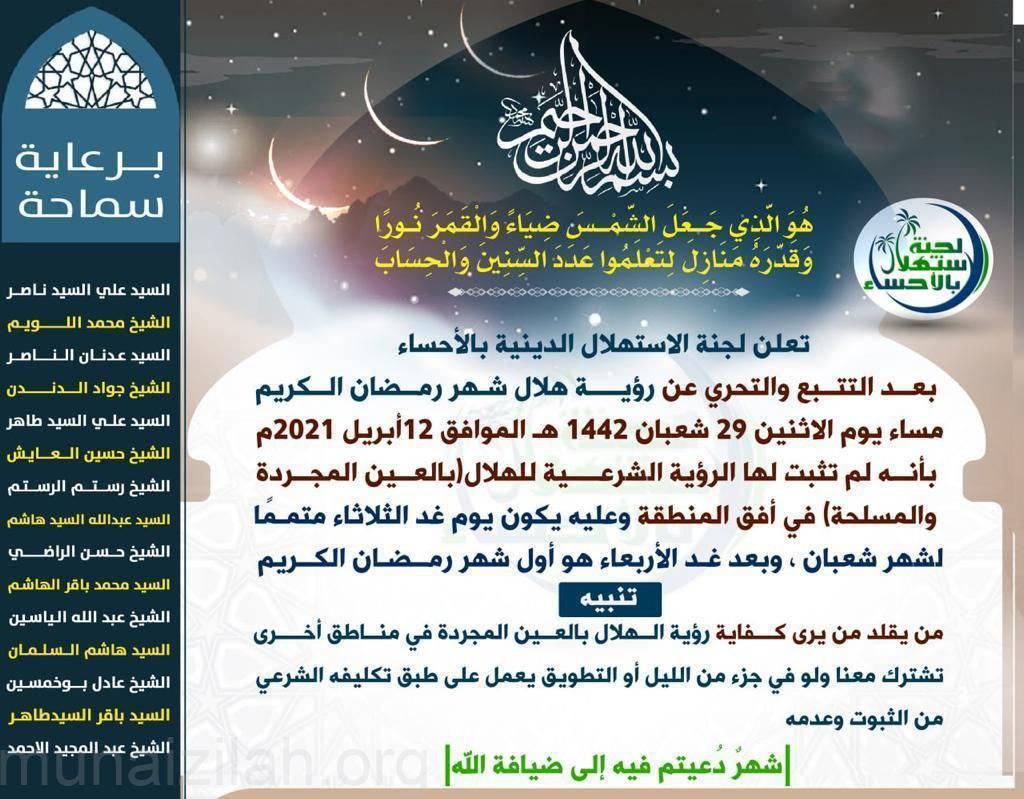 بعد التتبع والتحري لرؤية هلال شهر رمضان لعام ١٤٤٢هـ مساء اليوم الأثنين أعلنت لجنة الإستهلال الدينية بالأحساء عن عدم ثبوت الرؤية الشرعية للهلال ( بالعين المجردة والمسلحة ) وعليه يكون غداً الثلاثاء متمماً لشهر شعبان المعظم ، والأربعاء أول أيام شهر رمضان المبارك لعام ١٤٤٢هـ.