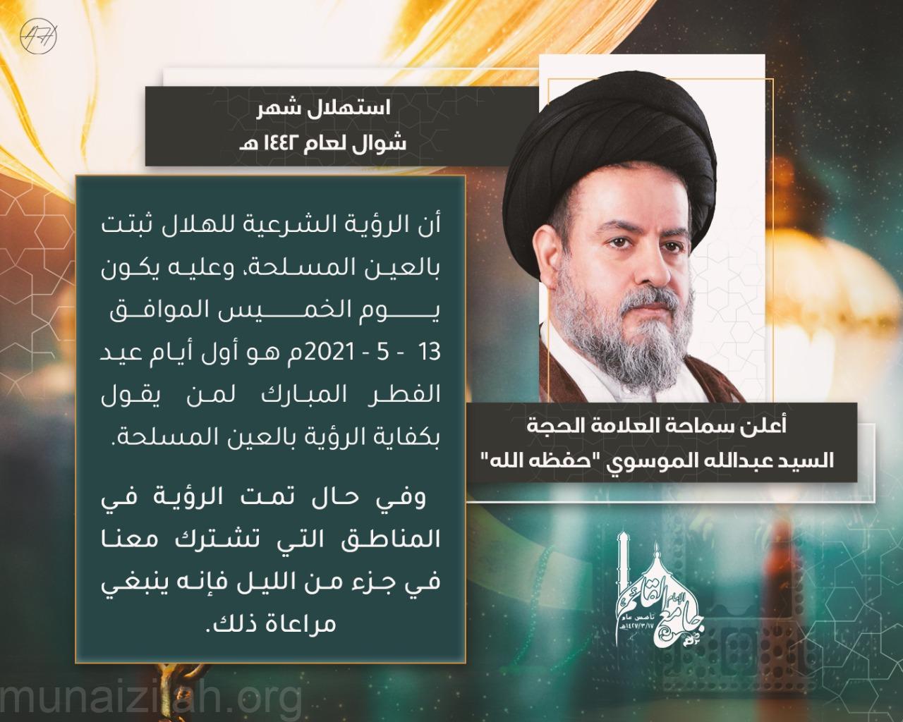 السيد الموسوي : غداً الخميس أول أيام عيد الفطر المبارك لعام 1442هـ لمن يرى كفاية الرؤية بالعين المسلحة