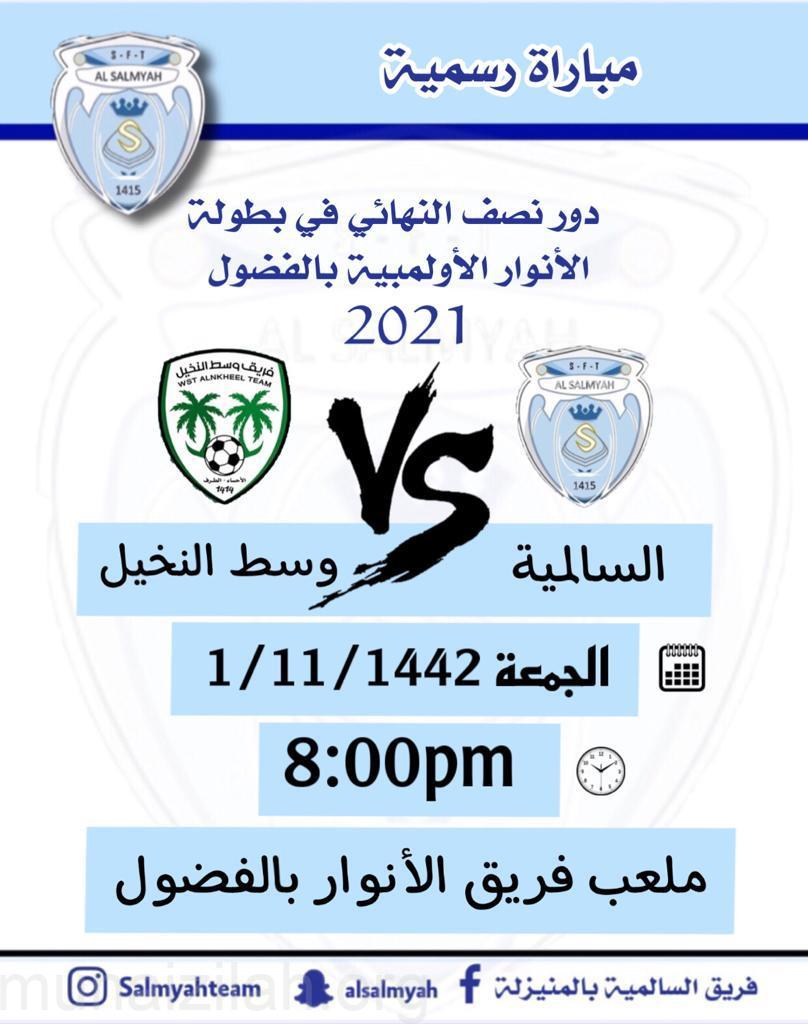 يخوض فريق «السالمية» بالمنيزلة اليوم الجمعة عند الساعة 8:00 مساءً مباراته الافتتاحية في النصف النهائي من بطولة الأنوار الرمضانية الأولمبية «بالفضول» حيث يواجه فريق «وسط النخيل» بالطرف