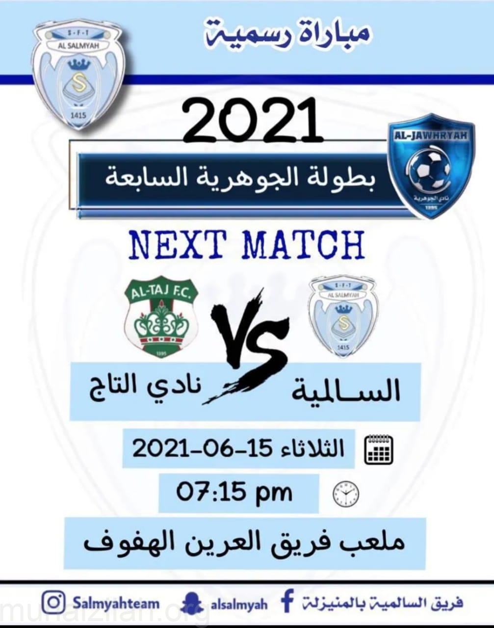 وعلى صعيد آخر يخوض الفريق مبارة مهمة اليوم الثلاثاء ضمن بطولة الجوهرية والتي يشارك فيها المتأهل لدور الثمانية عندما ينازل فريق التاج وقبلها تأهل الفريق لنهائي بطولة الأنوار عندما تغلب على فريق وسط النخيل وتأهل لمقابلة فريق الأنوار منظم البطولة .