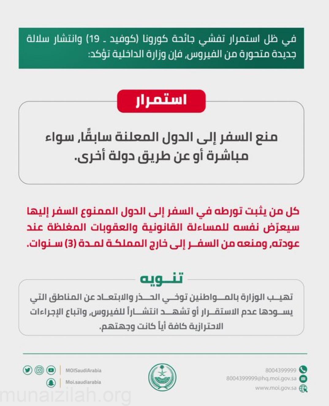أكدت #وزارة_الداخلية أن هناك معلومات وردت إليها حول سفر مواطنين إلى الدول المحظورة بسبب انتشار متحورات #كورونا وأن هذا الخرق في القوانين يوجب العقوبة والتي تتضمن المنع من السفر لمدة تصل إلى 3 سنوات، وعلى ذلك وجب التنويه، جاء ذلك في تغريدة أطلقتها الوزراة على حسابها قبل قليل في منصة تويتر.